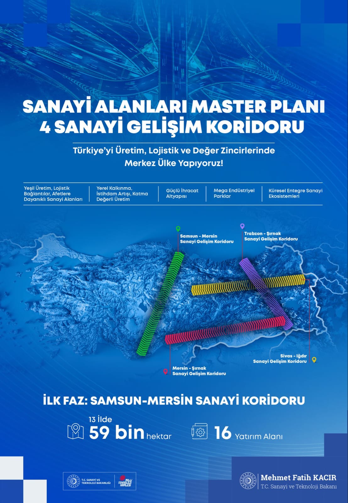 Sanayi ve Teknoloji Bakanı Mehmet Fatih Kacır, Sanayi Alanları Master Planının ilk fazında Samsun-Mersin hattında 13 ilde toplam 59 bin hektarlık 16 yeni sanayi yatırım alanını Resmî Gazete’de ilan ettiklerini belirterek, mevcut OSB’lerin ortalama 11 katı büyüklüğüne ulaşacak bu alanlarda, mega endüstriyel bölgeler inşa edileceğini açıkladı.